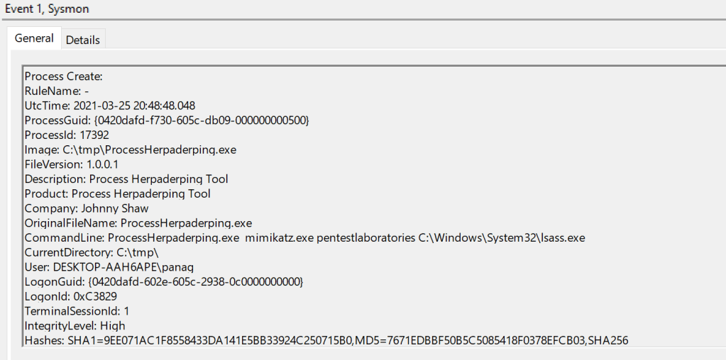 From the perspective of blue teaming the technique has generated two Sysmon events.