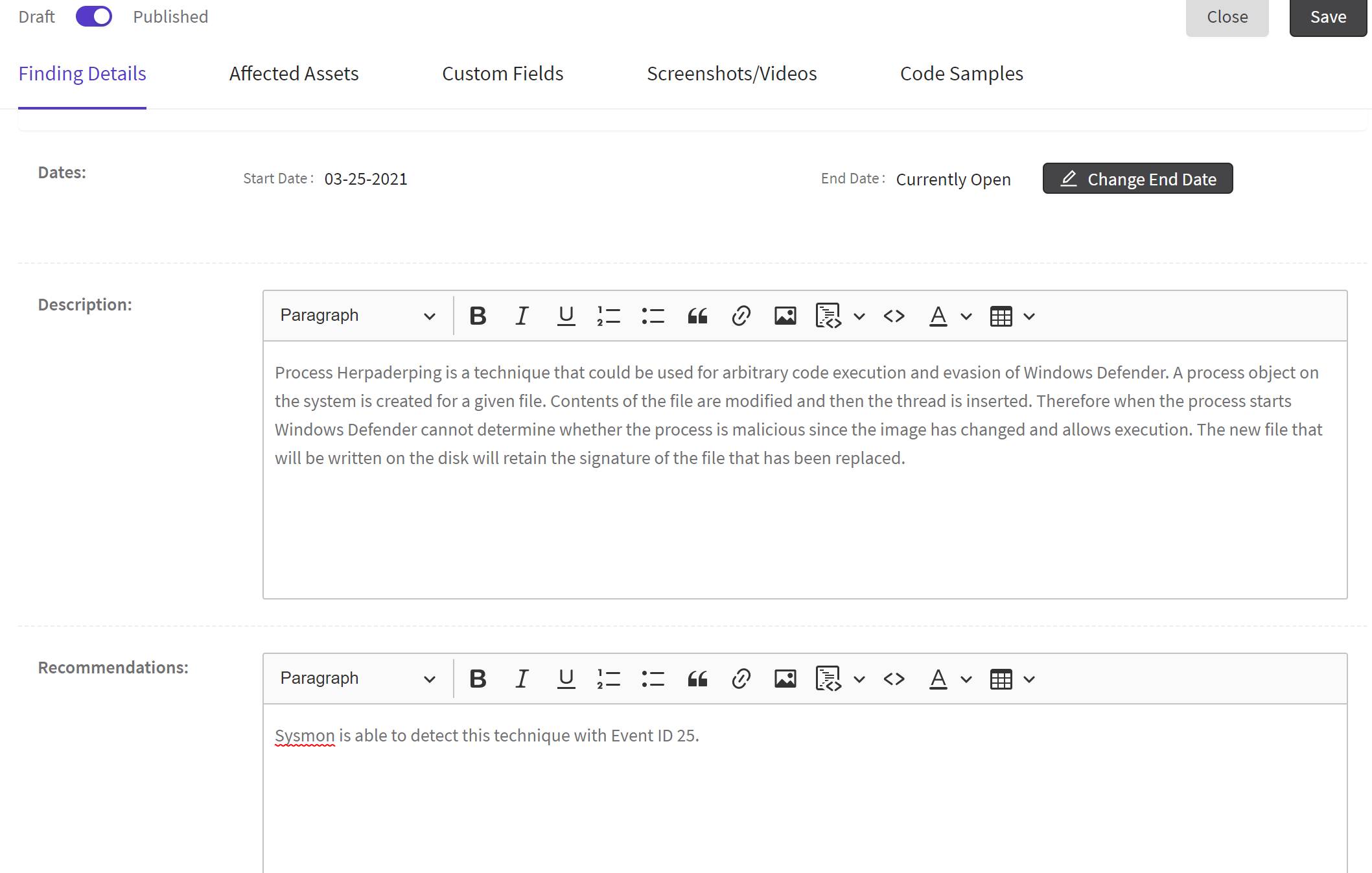 The same procedure has been followed in PlexTrac and for the other technique of dumping the lsass via the task manager. The results of the engagement have been added into the online report as PlexTrac contains various fields similarly to other pentest reporting tools. Code samples, screenshots and videos of the assessment could be added as well.