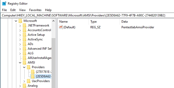 hr = SetKeyStringValue(HKEY_LOCAL_MACHINE, keyPath, nullptr, L"PentestlabAmsiProvider");