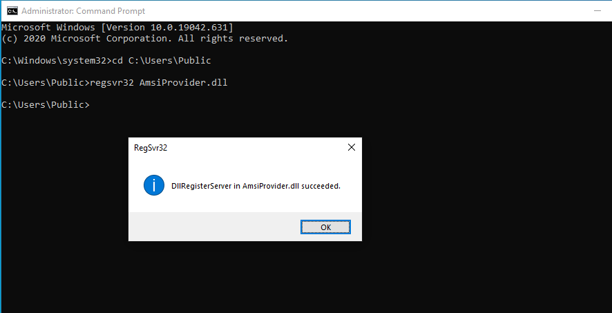 The AMSI Provider can be registered with the system with the regsvr32 utility.