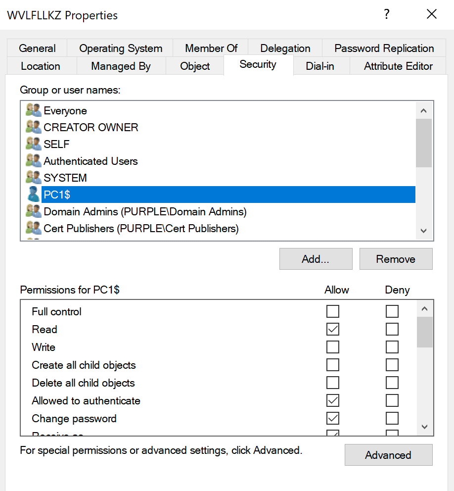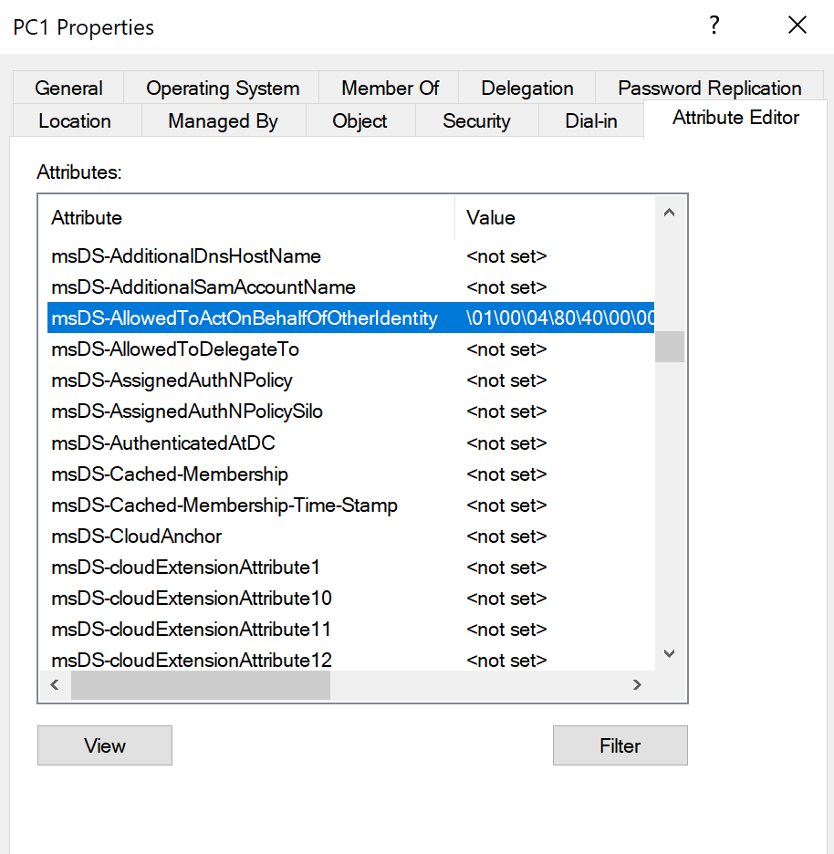 The attribute “msDS-AllowedToActOnBehalfOfOtherIdentity” of the PC1 (10.0.0.4) host has been modified and therefore the new machine account (WVLFLLKZ) has delegation permissions.