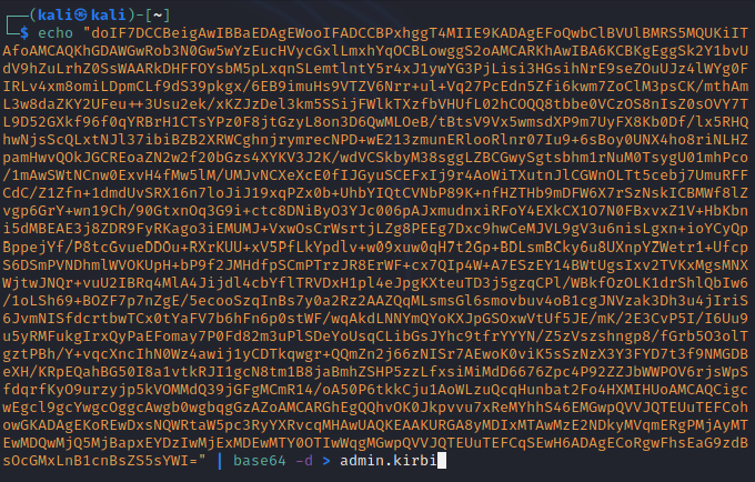 The ticket will be exported from Rubeus as based64 encoded. The following command will decode the ticket and write the output in a file with the .kirbi extension.