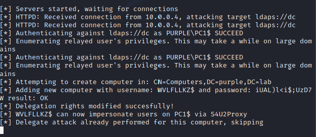 The machine account of the target host (PC1$) will authenticate with the domain controller via LDAP connection. Since the flag “–delegate-access” has been used during execution of ntlmrelayx a new computer account will be created on the domain with delegation permissions over the host PC1 (10.0.0.4).