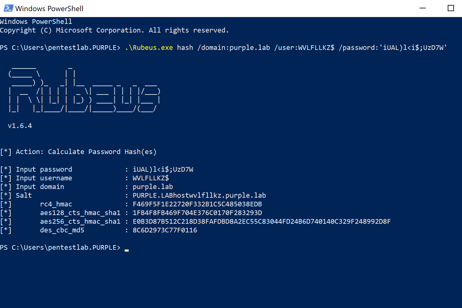 .\Rubeus.exe hash /domain:purple.lab /user:WVLFLLKZ$ /password:'iUAL)l<i$;UzD7W'