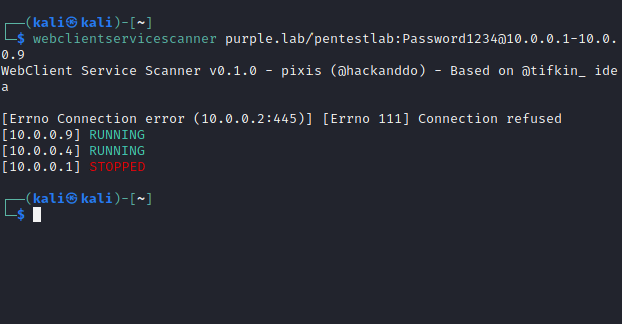 webclientservicescanner purple.lab/pentestlab:Password1234@10.0.0.1-10.0.0.9