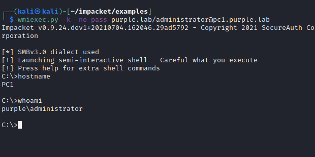 wmiexec.py -k -no-pass purple.lab/administrator@pc1.purple.lab