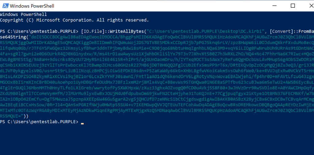 [IO.File]::WriteAllBytes("C:\Users\pentestlab.PURPLE\Desktop\DC.kirbi", [Convert]::FromBase64String("Base64"))
