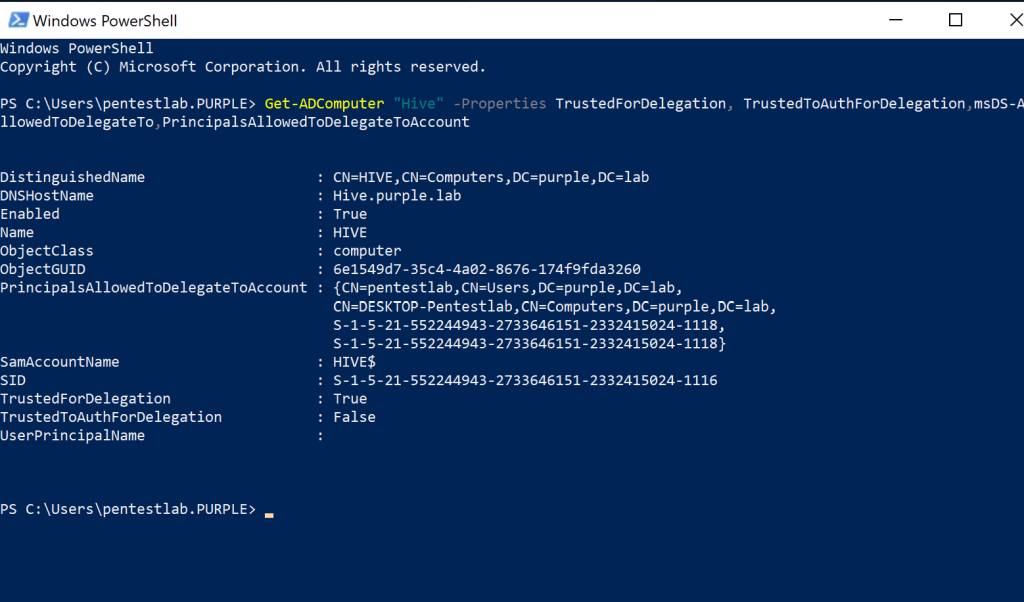 Get-ADComputer "Hive" -Properties TrustedForDelegation, TrustedToAuthForDelegation,msDS-AllowedToDelegateTo,PrincipalsAllowedToDelegateToAccount