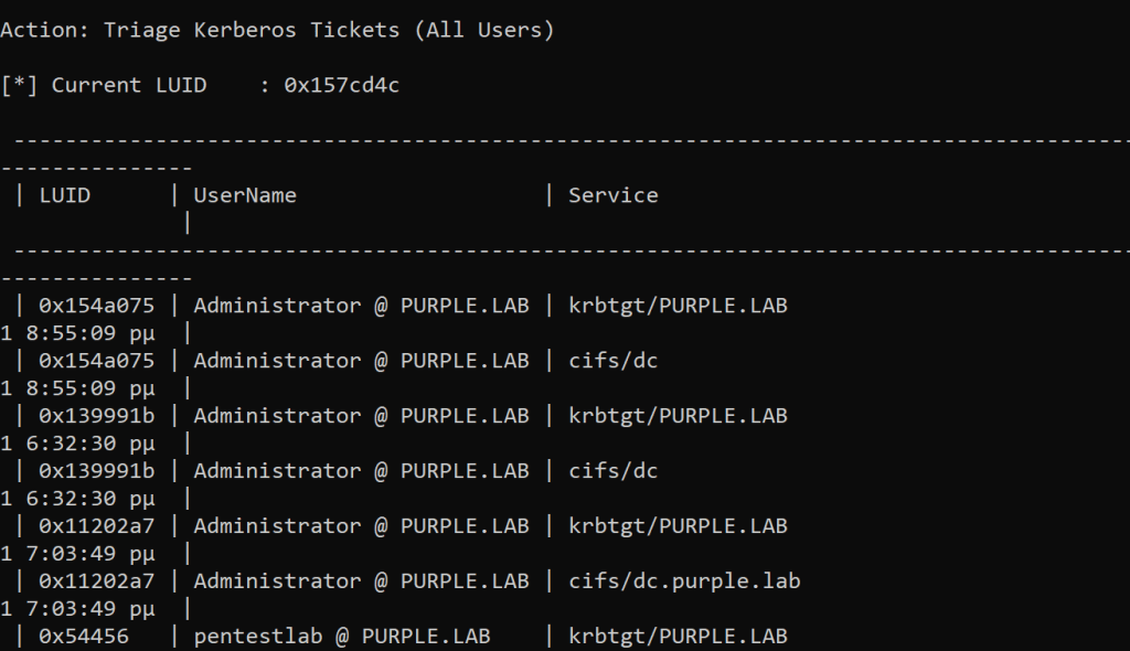 The triage action of Rubeus will display in a table the available Kerberos tickets which are stored in memory and their associated service.