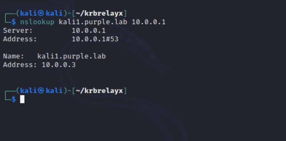 Executing “nslookup” will validate the DNS entry and that the host now resolves to “kali1.purple.lab“.