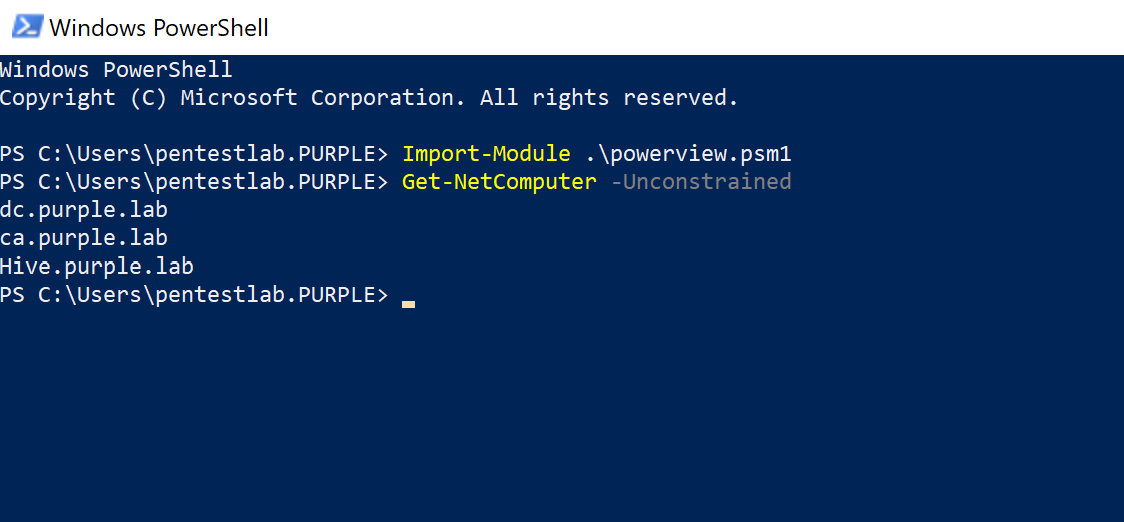 Alternatively, the “Get-NetComputer” module from PowerView can be used to discover hosts which are configured for unconstrained delegation.