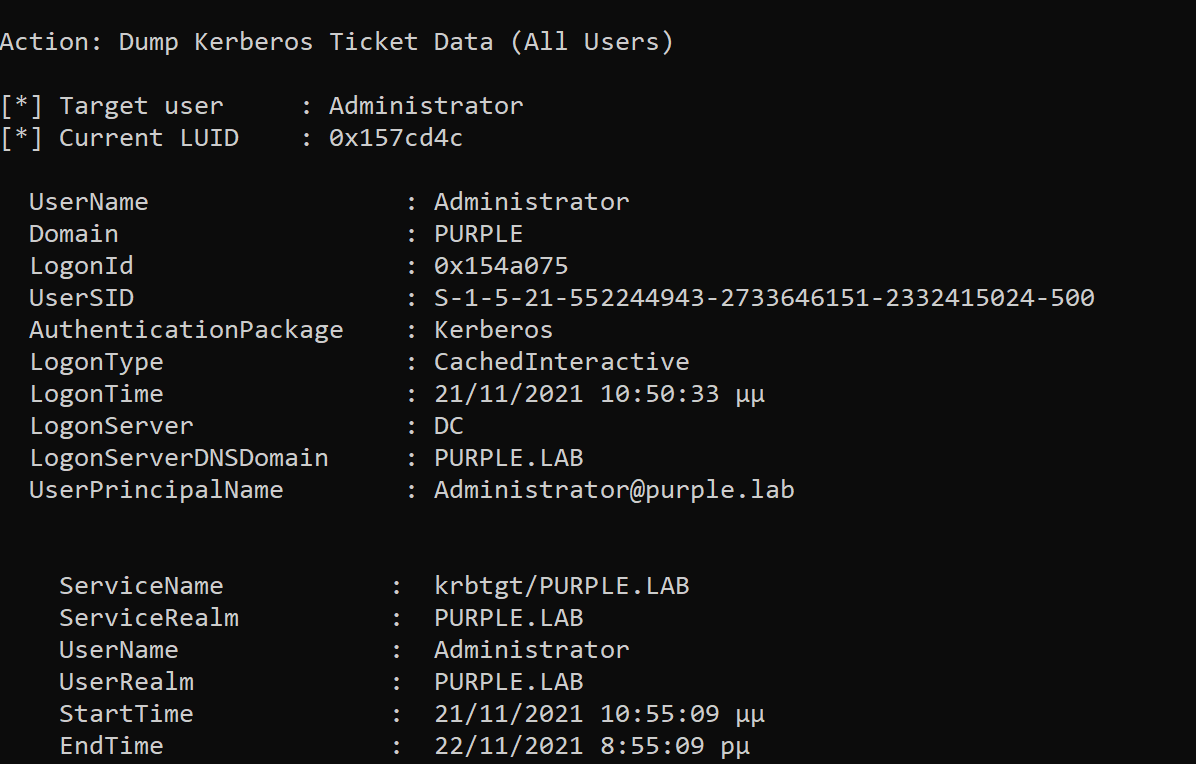 Since a ticket which belongs to the domain administrator exists in cache, executing the command below will dump all the tickets for that user.