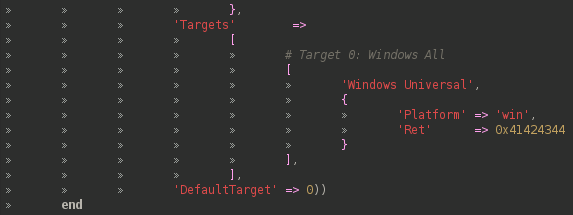 The next step is to define for which platform is this exploit for.In this specific example the exploit is for Windows.The Ret is the return address and the DefaultTarget is the index of the Targets array that should be the default target for the exploit.