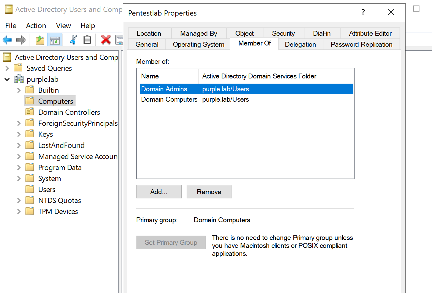 Examining the “Member Of” tab of the computer account properties can verify that the account has been added into the Domain Admins group.