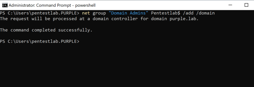 From an elevated command prompt executing the command below will add the machine account Pentestlab$ to the group of Domain Admins.