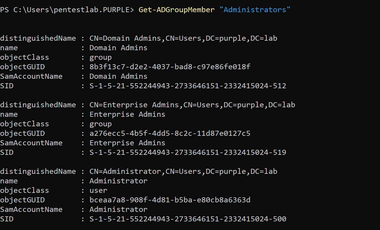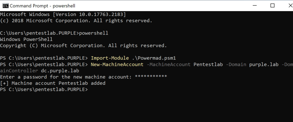 New-MachineAccount -MachineAccount Pentestlab -Domain purple.lab -DomainController dc.purple.lab