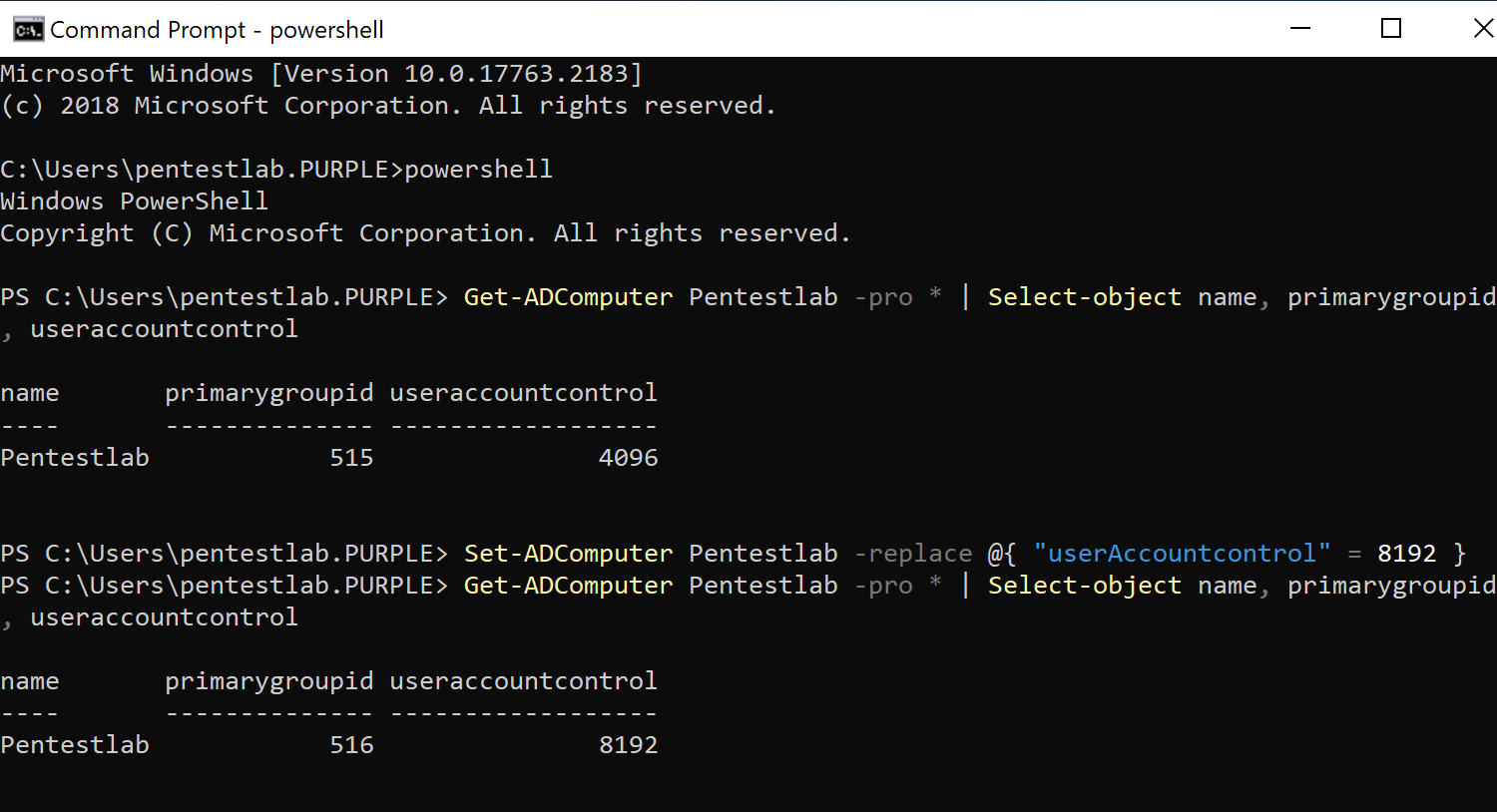 Set-ADComputer Pentestlab -replace @{ "userAccountcontrol" = 8192 }