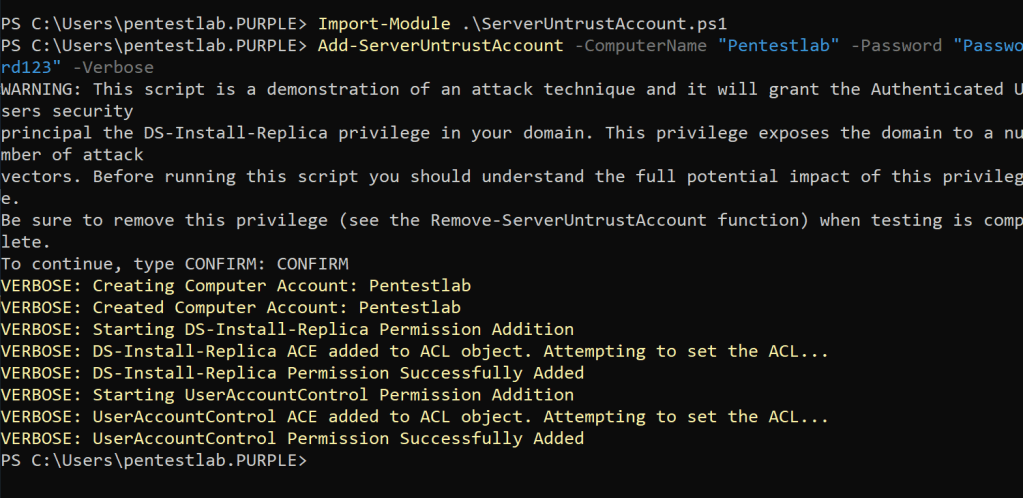 Add-ServerUntrustAccount -ComputerName "Pentestlab" -Password "Password123" -Verbose