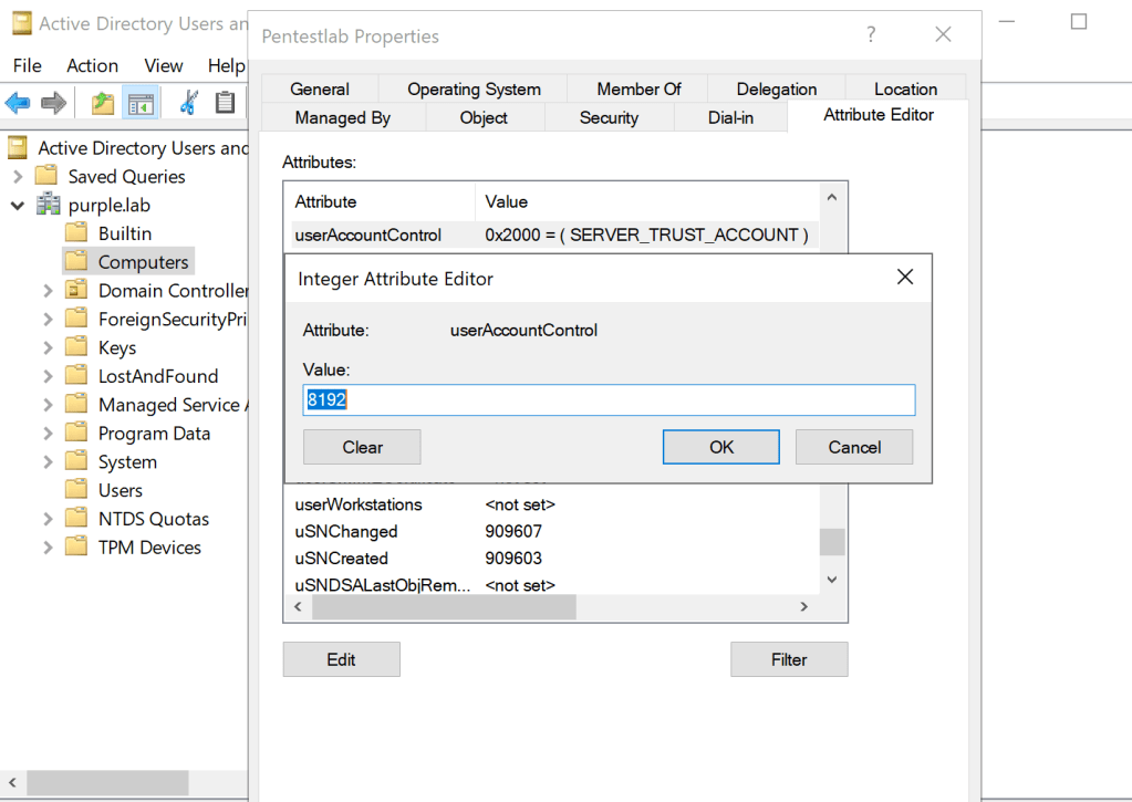By default standard users on a domain are allowed to create up to 10 machine accounts which is specified by the ms-DS-MachineAccountQuota attribute. Creation of computer accounts is trivial and can be conducted by a number of tools both from domain joined and non-domain joined hosts. However, in order for a computer account to appear as a domain controller the userAccountControl attribute needs to have the value of 0x2000 = ( SERVER_TRUST_ACCOUNT ). The 0x2000 is a hex number which in decimal is the number 8192. Modification of this attribute requires domain administrator level privileges. The image below represents how the attribute could be modified from the perspective of Active Directory.