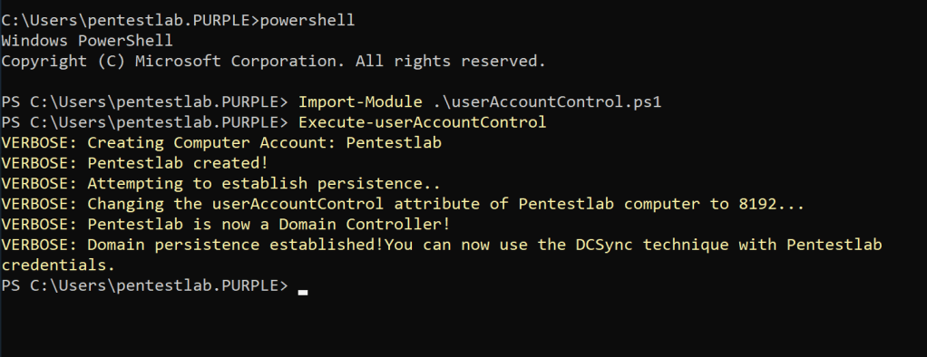 Execution of the script will provide the following output in the console and the computer can be used to perform the DCSync technique.