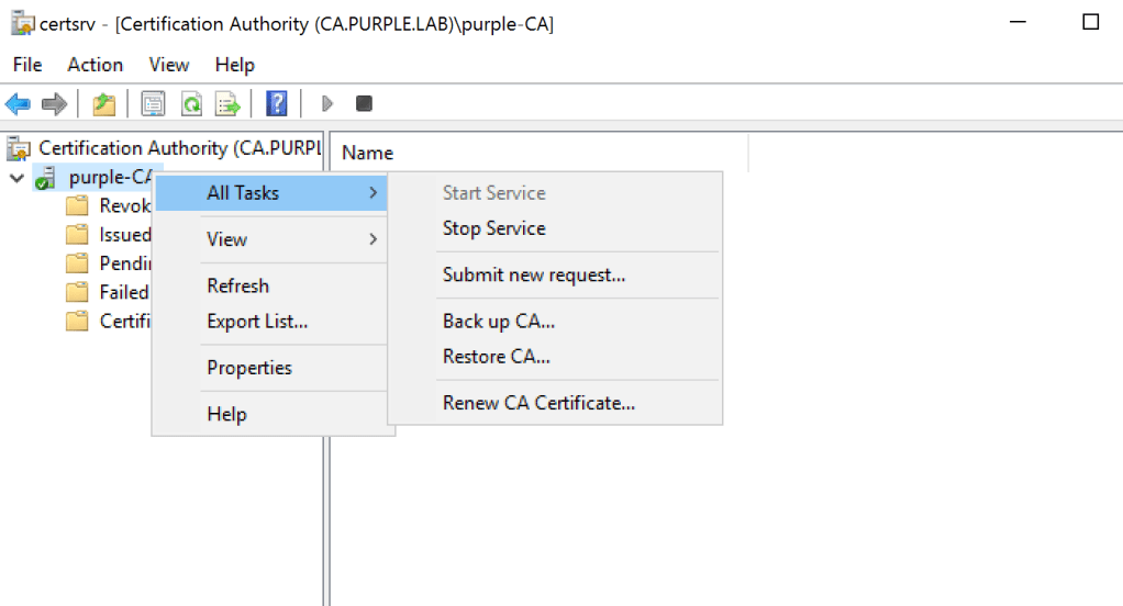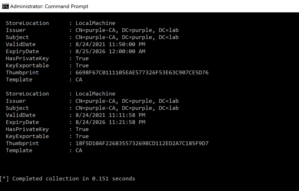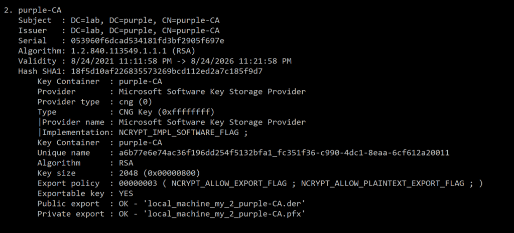 However, there are multiple other methods which can be used to extract the CA certificate and the private key from the server. Executing Seatbelt with the parameter “Certificates” can enumerate the stored CA certificates.