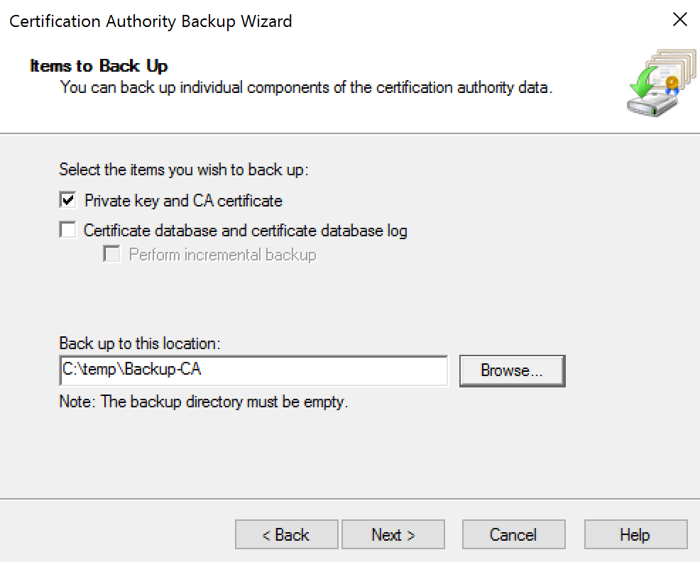 In the certification authority back up wizard the private key and the CA certificate they can both exported into a specified location.