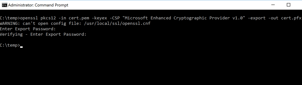 openssl pkcs12 -in cert.pem -keyex -CSP "Microsoft Enhanced Cryptographic Provider v1.0" -export -out cert.pfx